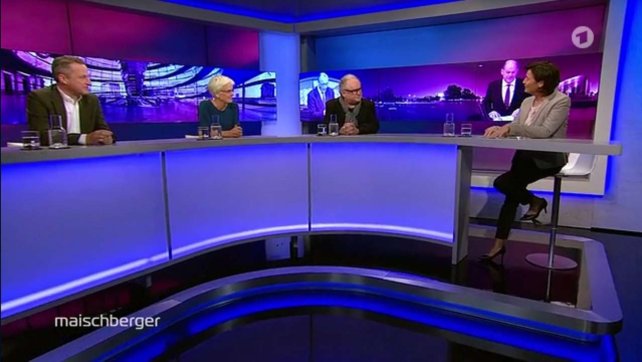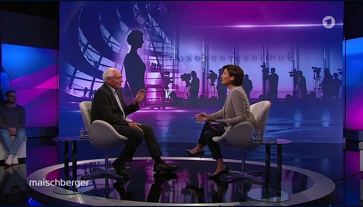 Das Blog-Vorschaubild zu diesem Beitrag ist ein Screenshot des Eingangsbildschirms des Gesamtvideos der Maischberger-Sendung.