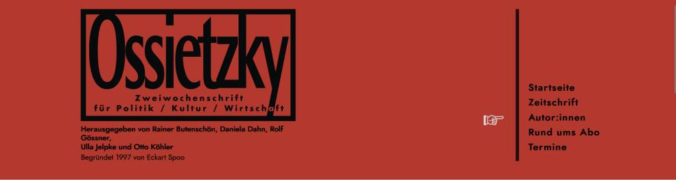 Ossietzky, Zweiwochenschrift für Politik, Kultur, Wirtschaft, wurde 1997 von Publizisten gegründet, die zumeist Autoren der 1993 eingestellten Weltbühne gewesen waren – inzwischen sind viele jüngere hinzugekommen. Sie ist nach Carl von Ossietzky, dem Friedensnobelpreisträger des Jahres 1936, benannt, der 1938 nach jahrelanger KZ-Haft an deren Folgen gestorben ist. In den letzten Jahren der Weimarer Republik hatte er die Weltbühne als konsequent antimilitaristisches und antifaschistisches Blatt herausgegeben; das für Demokratie und Menschenrechte kämpfte, als viele Institutionen und Repräsentanten der Republik längst vor dem Terror von rechts weich geworden waren. Dieser publizistischen Tradition sieht sich die Zweiwochenschrift Ossietzky verpflichtet – damit die Berliner Republik nicht den gleichen Weg geht wie die Weimarer. Wenn tonangebende Politiker und Publizisten die weltweite Verantwortung Deutschlands als einen militärischen Auftrag definieren, den die Bundeswehr zu erfüllen habe, dann widerspricht Ossietzky. Wenn sie Flüchtlinge als Kriminelle darstellen, die abgeschoben werden müßten, und zwar schnell, dann widerspricht Ossietzky. Wenn sie Demokratie, Menschenrechte, soziale Sicherungen und Umweltschutz für Standortnachteile ausgeben, die beseitigt werden müßten, dann widerspricht Ossietzky. Wenn sie behaupten, Löhne müßten gesenkt, Arbeitszeiten verlängert werden, damit die Unternehmen viele neue Arbeitsplätze schaffen, dann widerspricht Ossietzky – aus Gründen der Humanität, der Vernunft und der geschichtlichen Erfahrung. Ossietzky erscheint alle zwei Wochen – jedes Heft voller Widerspruch gegen angstmachende und verdummende Propaganda, gegen Sprachregelungen, gegen das Plattmachen der öffentlichen Meinung durch die Medienkonzerne, gegen die Gewöhnung an den Krieg und an das vermeintliche Recht des Stärkeren. Kein Hochglanzpapier, kein Farbdruck, keine Bilder. Die Überschriften sind nicht größer als der Text. Denn auf ihn kommt es uns an. Klartext.