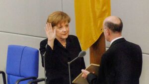 Bundeskanzlerin Angela Merkel bei der Vereidigung im Deutschen Bundestag (r. Norbert Lammert, Präsident der Bundestags).