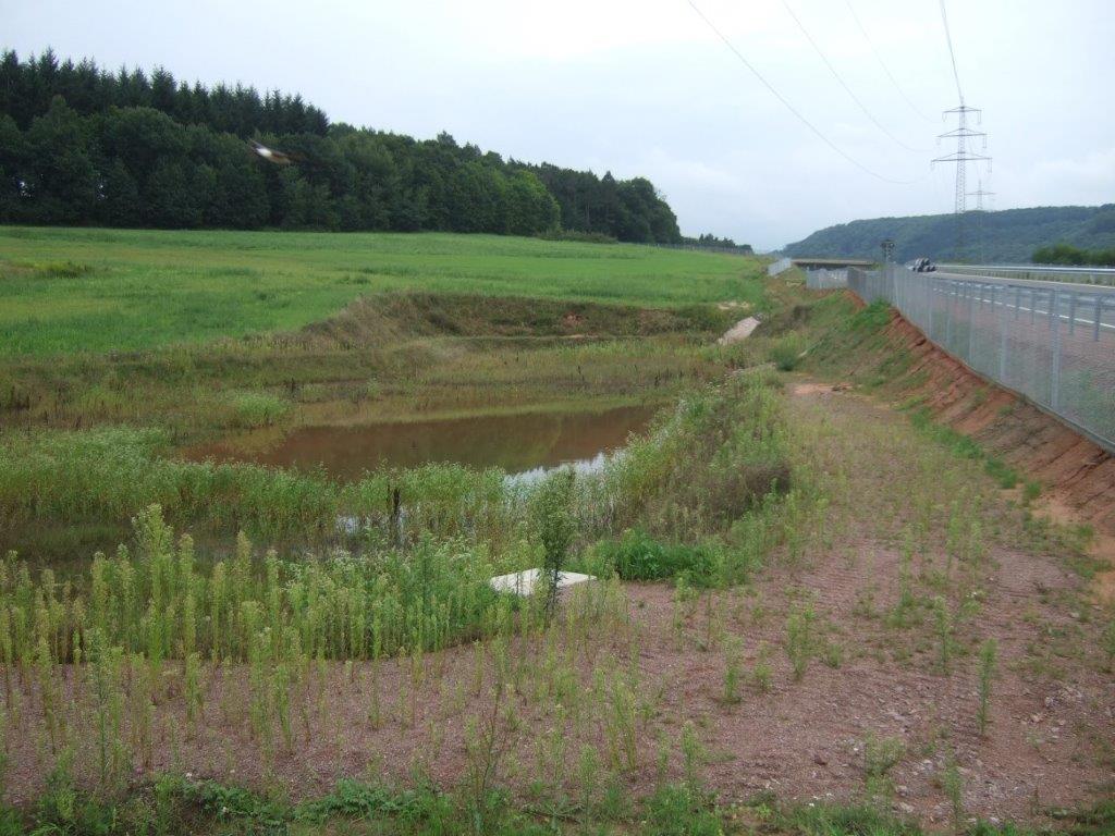 Oberflächenwasser wird im neuangelegten Retensionsbecken aufgefangen. Verschiedenste Vögel einschließlich Wildenten bevölkern die neugeschaffene Wasser- und Biotopfläche.