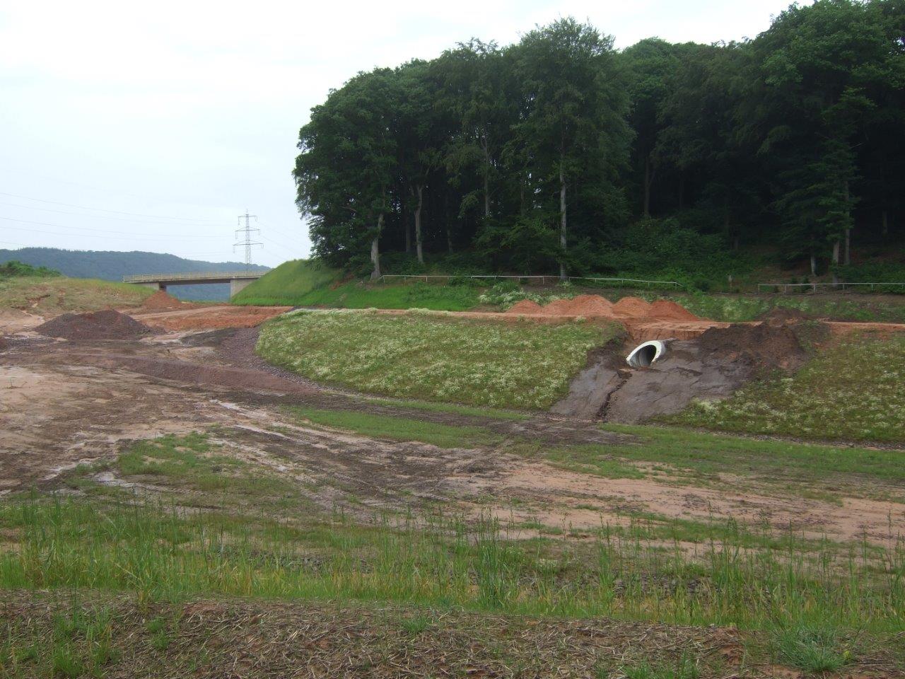 Im Hintergrund links: künftige Auf- und Abfahrt Tawern. Bildmitte rechts: Durchlass für Gewässerabfluss und Wildtiere