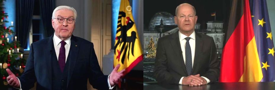 Weihnachtsansprache des Bundespräsidenten (l) und die Neujahrsrede des Kanzlers (vom BR in Kurzform)- beide Würdenträger aus den Reihen der deutschen Sozialdemokraten – hatten es beileibe nicht leicht, im Entferntesten positive Perspektiven an das „Volk“ zu richten. Zu tief ist die Stimmung der Bürgerinnen und Bürger gegenüber der deutschen Führungsebene gesunken, Wer Hoffnungen predigt, der sollte den selbstgeschaffenen Unsäglichkeiten nicht noch die Krone des erfolgreichen Regierens aufsetzen. Bild: Eigene Montage aus Screenshots ARD